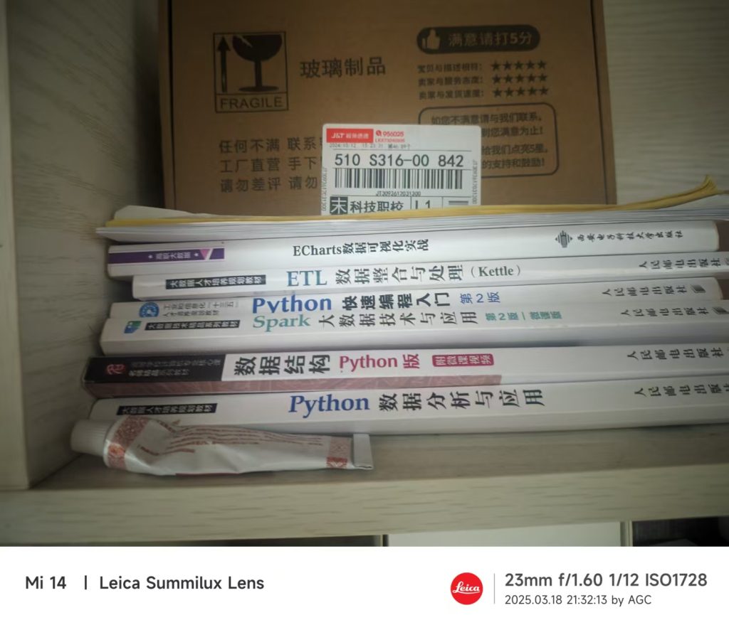 这就是我的大学所用的大部分书籍,还有一些在家里没拿来了,确实python学的还是挺多的,因为我选的专业是大数据技术,自我感觉没啥大用哈,也还是皮毛